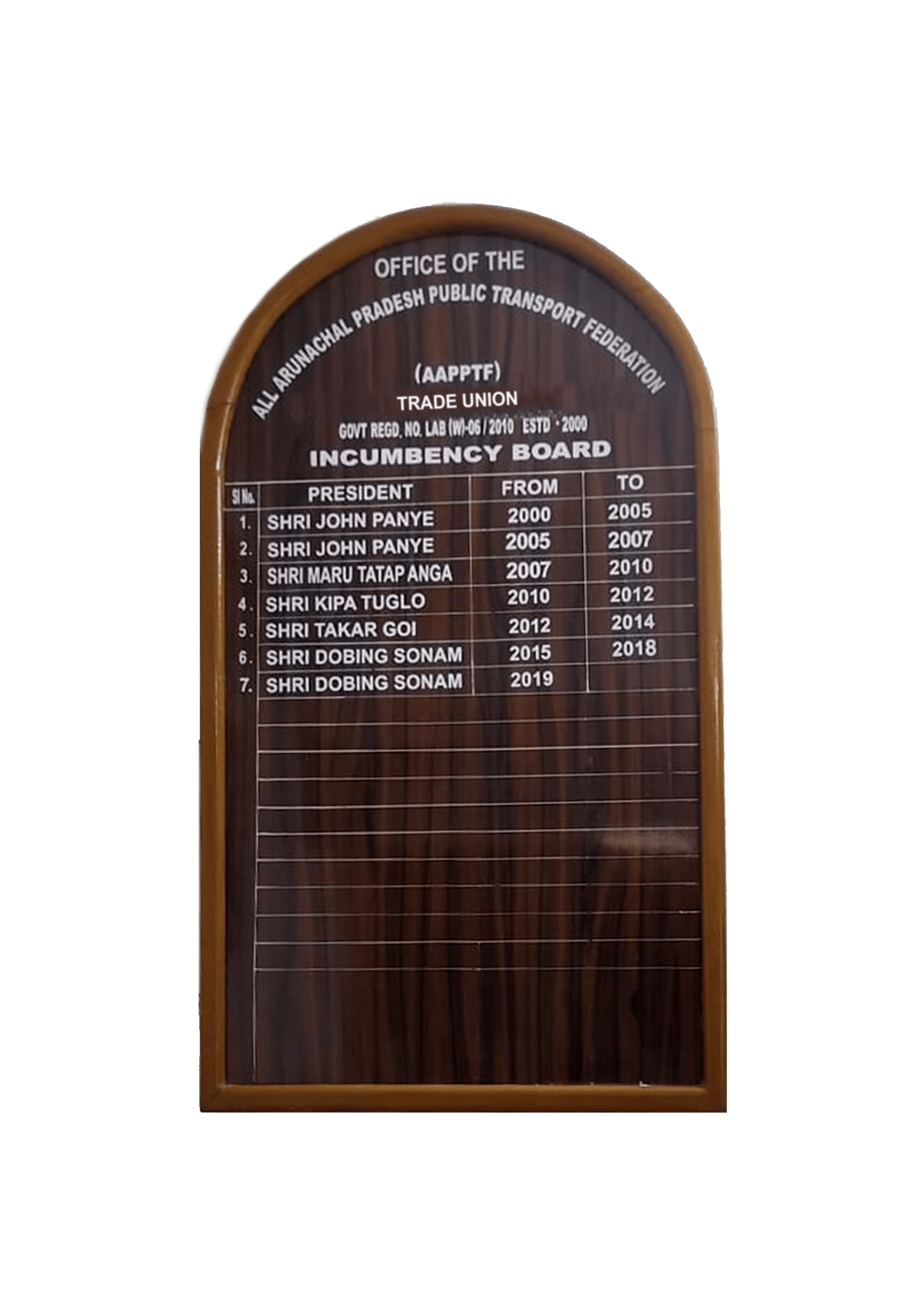 In the year 2008, Shri Dobing Sonam assumed the esteemed position of State General Secretary of the All Arunachal Pradesh Public Transport Federation(AAPPTF),backed by the unwavering love and support of leaders from various transport unions and the dedicated transport workers across the state. His appointment marked a turning point in the federation’s journey, ushering in a new era of unity, advocacy, and progress for the transport community. Under his steadfast leadership, AAPPTF has grown in strength and influence, consistently championing the rights and welfare of transport workers. Shri Sonam’s enduring commitment and visionary guidance have earned him deep respect and trust, allowing him to serve in this role with distinction to this day. His continued leadership stands as a testament to his tireless eff orts and the collective faith the transport fraternity places in him. During the year 2008, the All Arunachal Pradesh Public Transport Federation (AAPPTF) witnessed a period of dynamic leadership and committed service under the stewardship of Shri Dobing Sonam as the State General Secretary and Mr. Maru Tatap Anga as the State President. Their tenure marked a significant chapter in the federation’s history, characterized by a shared vision and tireless eff orts to uplift the transport fraternity across the state. Shri Dobing Sonam, known for his organizational acumen and grassroots engagement, played a pivotal role in streamlining communication between transport operators and regulatory bodies. His proactive approach ensured that the concerns of drivers, owners, and allied workers were addressed with sincerity and urgency. Complementing his eff orts, Mr. Maru Tatap Anga brought strategic leadership and a deep understanding of the sector’s challenges, fostering unity and resilience among members