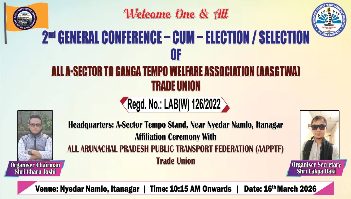 Today, 16th March 2026, the 2nd General Conference cum Election/Selection of the All A-Sector to Ganga Tempo Welfare Association (AASGTWA) Trade Union was successfully held at Nyedar Namlo, Itanagar. The programme was also conducted in affiliation with the All Arunachal Pradesh Public Transport Federation (AAPPTF) Trade Union.