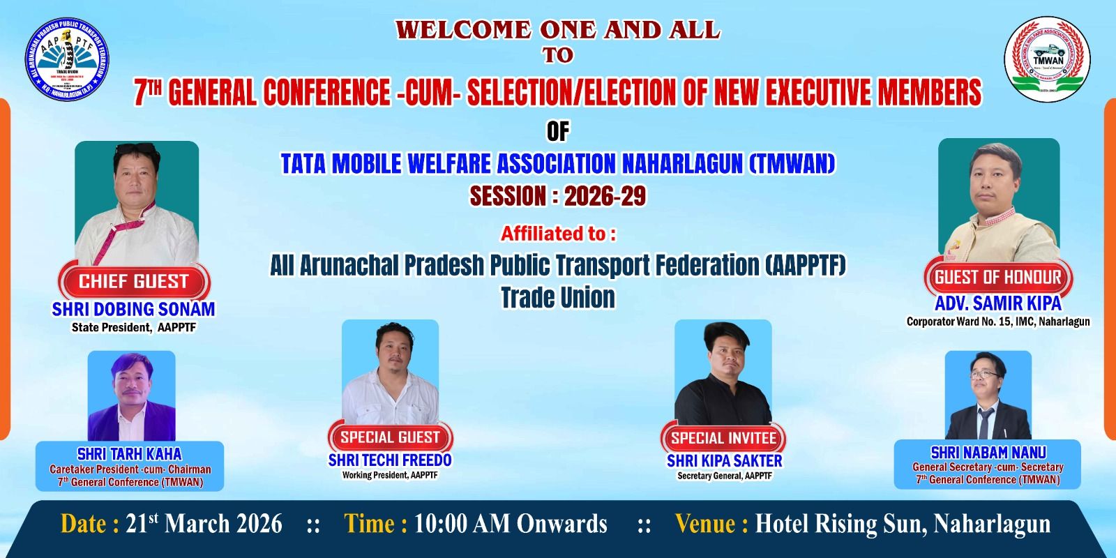 It gives us great pleasure to invite you to the 7th General Conference of the Tata Mobile Welfare Association, Naharlagun.